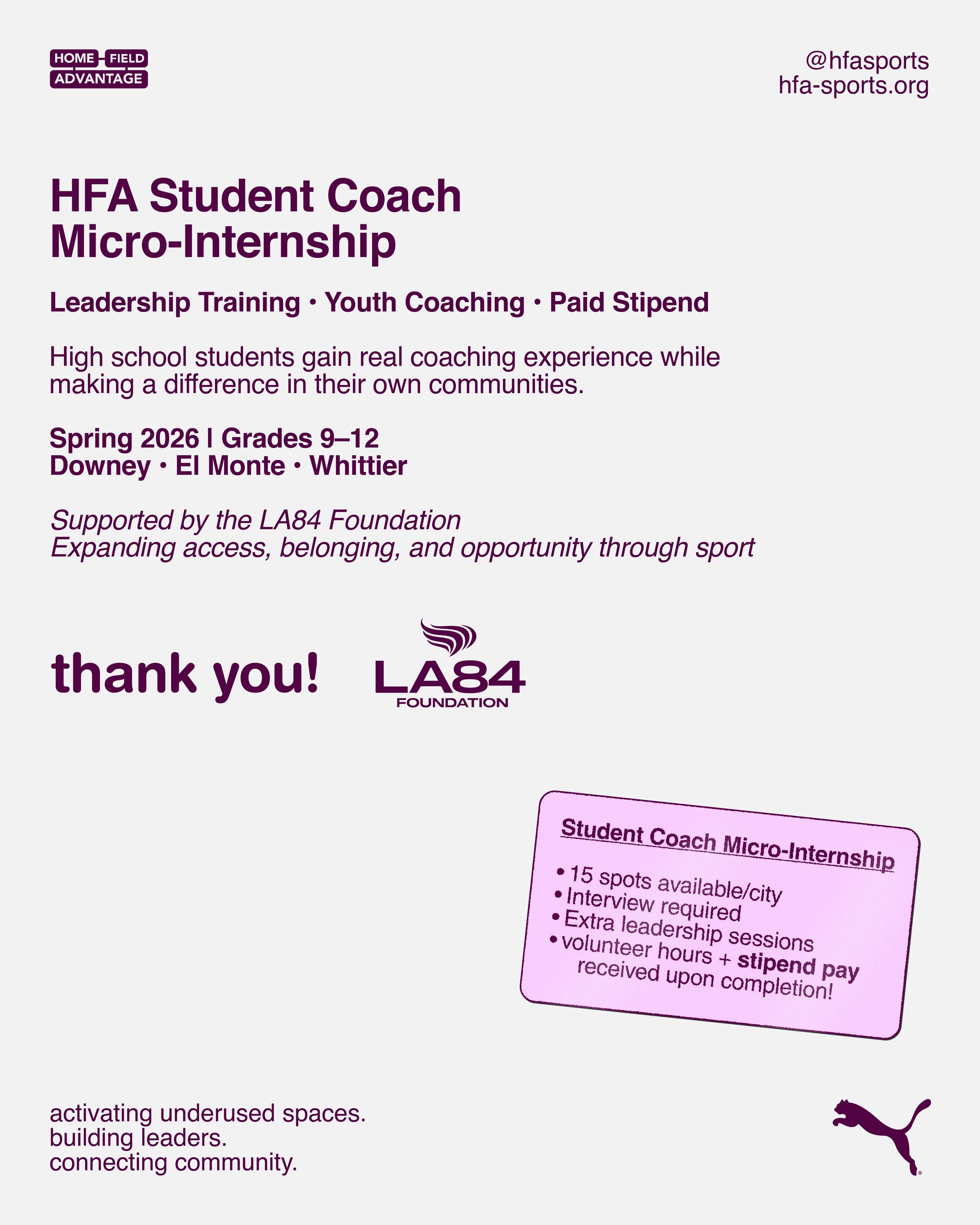 Home Field Advantage is excited to announce the official launch of our Student Coach Micro-Internship, made possible through the generous support of the LA84 Foundation. This marks a significant milestone in the ongoing growth of our Student Coach Program and our dedication to investing in local youth leaders through sports.